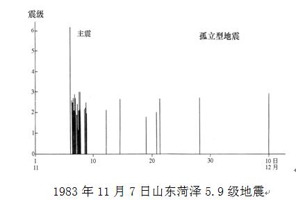 孤立型地震:有突出的主震,余震次數(shù)少、強(qiáng)度低;主震所釋放的能量占全序列的99.9%以上;主震震級(jí)和最大余震相差2.4級(jí)以上。