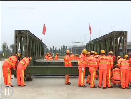 演練現(xiàn)場,模擬近日連降大雨,公路橋梁被沖毀,交通中斷,為確保道路安全暢通,要求在最短的時間內(nèi),架設應急ZB-200型裝配式公路鋼橋。參加演練的30名鋼橋突擊隊員分成桁架組、橫梁組、聯(lián)結(jié)組、橋面組4組,比預案提前10分鐘安全、快速地架設了一座寬3.75米、長21米的公路戰(zhàn)備鋼橋,演練圓滿成功。