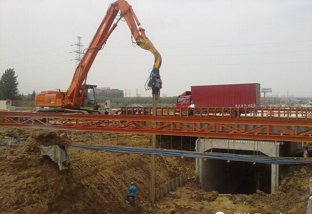 本工程可采用振動錘拔樁:利用振動錘產(chǎn)生的強迫振動,擾動土質(zhì),破壞鋼板樁周圍土的粘聚力以克服拔樁阻力,依靠附加起吊力的作用將其拔除。