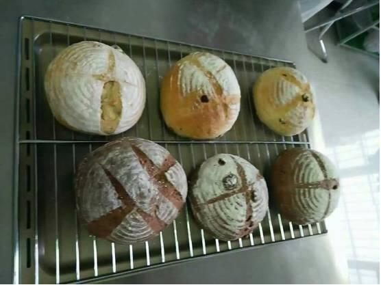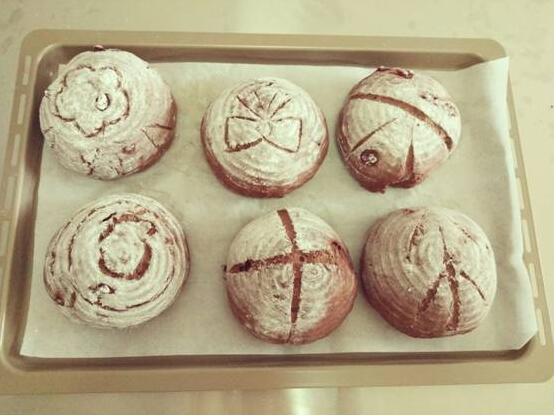 PS:“天然酵種巧克力鄉(xiāng)村面包”制作食材:高粉148g、食用鹽2.5g、白砂糖24g、奶粉8g、可可粉8g、黃油12g、果干15g、水90g、酵母3g。