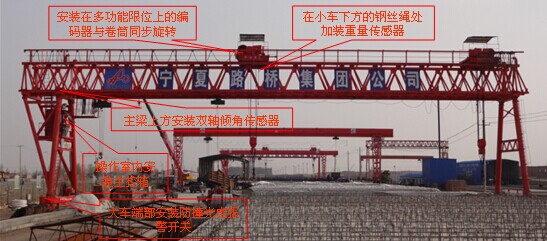 隨著我國經(jīng)濟建設的發(fā)展,在基礎設施現(xiàn)代化建設過程中,起重機械發(fā)揮了重要的作用。門式起重機作為一種起重設備,廣泛應用于各種工礦企業(yè)、交通運輸及建筑施工等領域。近幾年,伴隨寧夏境內(nèi)公路施工項目的增多,門式起重機在公路施工現(xiàn)場的使用數(shù)量也逐漸增加。然而,由于門式起重機自身設計缺陷和工作人員高空野外作業(yè)出現(xiàn)人為失誤等原因,起重機在使用過程中隱藏危險因素較多,極容易發(fā)生事故。2014年4月,國家質(zhì)檢總局和國家安全監(jiān)管總局聯(lián)合發(fā)出通知,要求使用單位對在用的100噸及以上通用門式起重機依據(jù)GB/T28264-2012進行改造,完成加裝安全監(jiān)控管理系統(tǒng)的工作。因此,針對施工現(xiàn)場門式起重機在使用過程中存在的一些安全隱患,寧夏路橋工程股份有限公司于2014年4月份引入簡單實用的新型門式起重機安全監(jiān)控和保護系統(tǒng)。門式起重機安全監(jiān)控系統(tǒng)應用項目的實施主要依托銀川至中寧高速公路(銀川至滑石溝段)第LJ1合同段,具體實施地點選擇在該項目的箱梁預制場。對其中2臺正在使用的門式起重機安裝安全監(jiān)控系統(tǒng),并試用1~2個月的時間,如果該系統(tǒng)能夠有效預防和抑制事故發(fā)生,達到了預期效果,計劃在全公司范圍內(nèi)進行推廣使用。