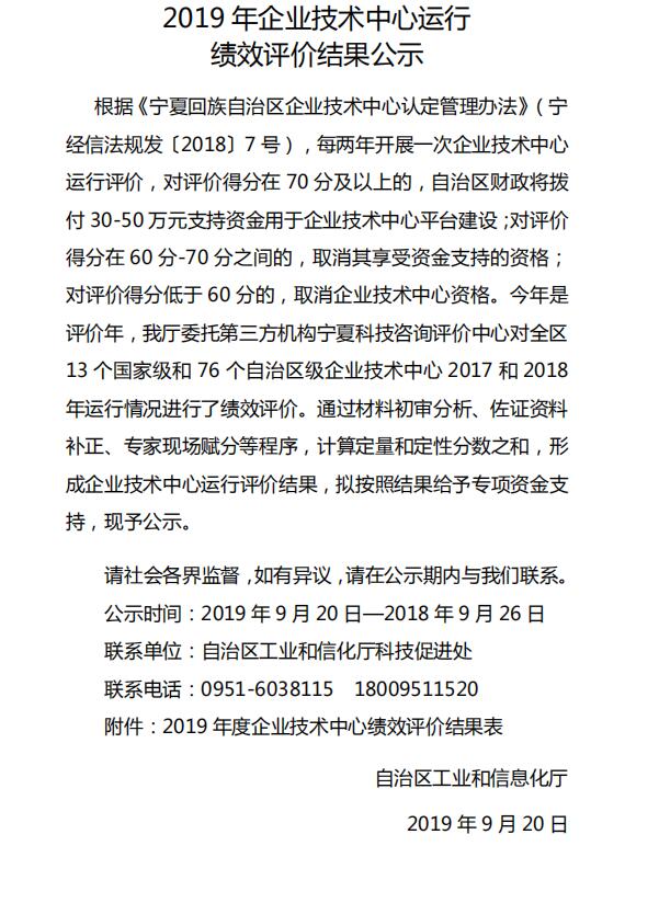 2019 年企業(yè)技術(shù)中心運(yùn)行績(jī)效評(píng)價(jià)結(jié)果公示