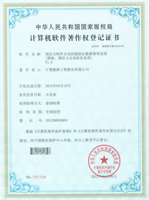 預(yù)應(yīng)力構(gòu)件自動(dòng)控制張拉數(shù)據(jù)管理系統(tǒng) 軟件著作權(quán)登記證書