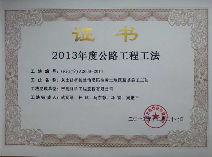 公路工程工法證書:灰土擠密樁處治濕陷性黃土地區(qū)路基施工工法