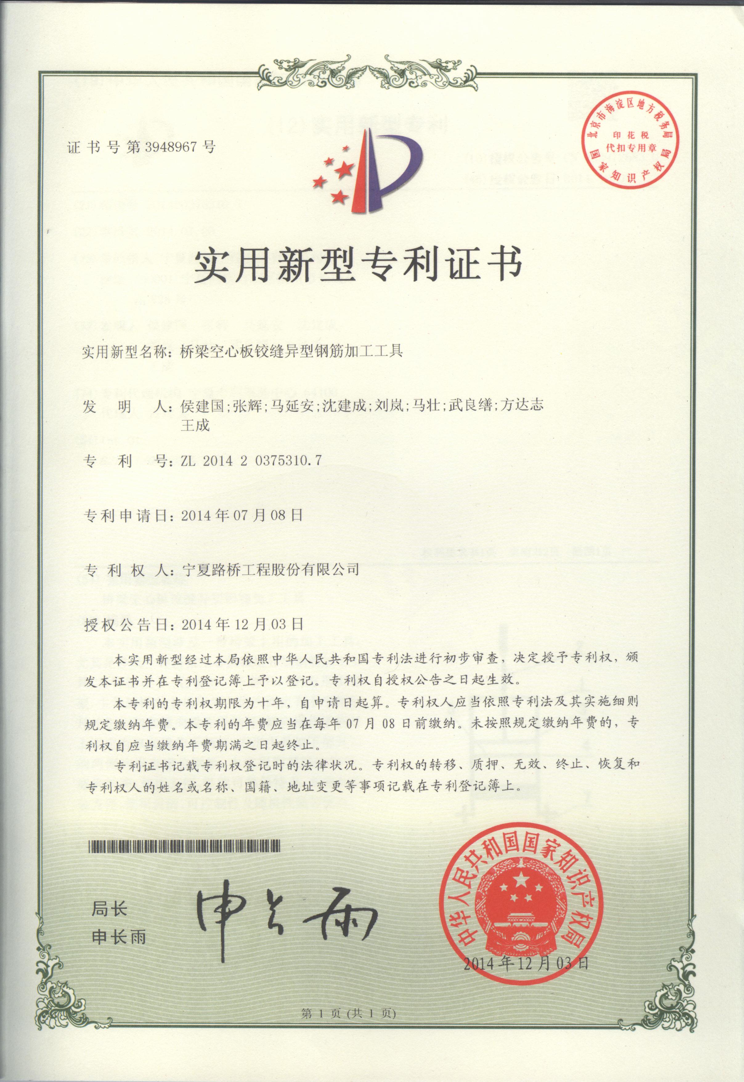 實用新型專利證書:橋梁空心板鉸縫異型鋼筋加工工具