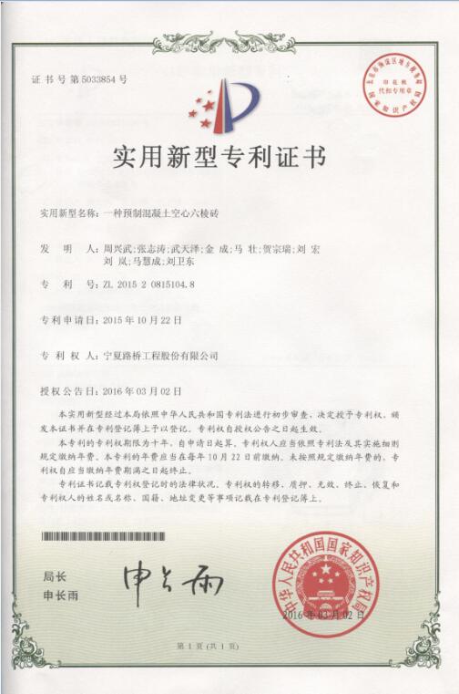 實(shí)用新型專利證書:橋梁預(yù)制空心板腹板混凝土自動(dòng)鑿毛的設(shè)備