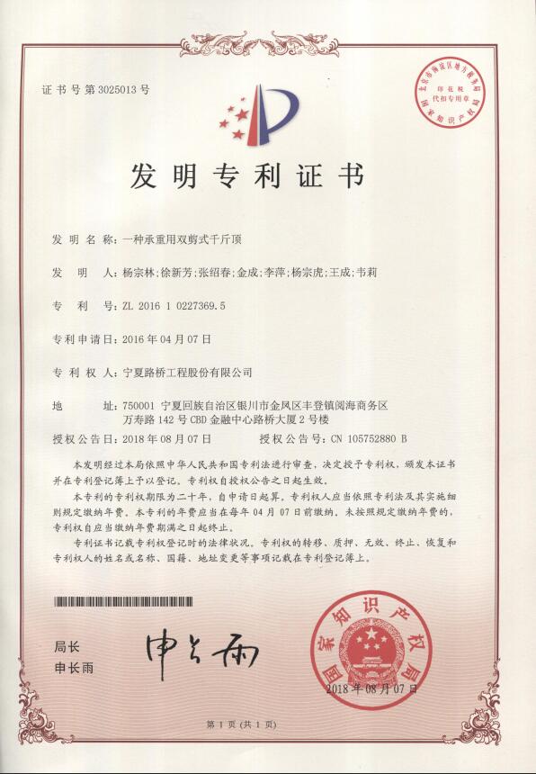 發(fā)明專利證書:一種承重用雙剪式千斤頂