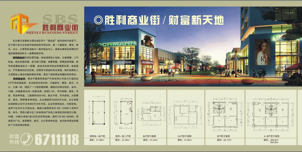 銀川市興慶區(qū)勝利南街的勝利商業(yè)街,是由寧夏辰隆房地產(chǎn)開發(fā)有限公司傾力打造的近3萬平方米的高品質(zhì)、多功能綜合商業(yè)街。是一個集超市、餐飲、娛樂、辦公、公寓等多功能為一體的商業(yè)中心,是按永康商業(yè)街模式打造的城南板塊的又一條餐飲娛樂街。勝利商業(yè)街區(qū)域位置優(yōu)越,地處城南核心地段,交通便捷,人氣旺盛,商業(yè)氛圍濃厚。是與南門商圈、麗景商圈、附屬醫(yī)院商圈、新華街商圈組成的又一商圈。