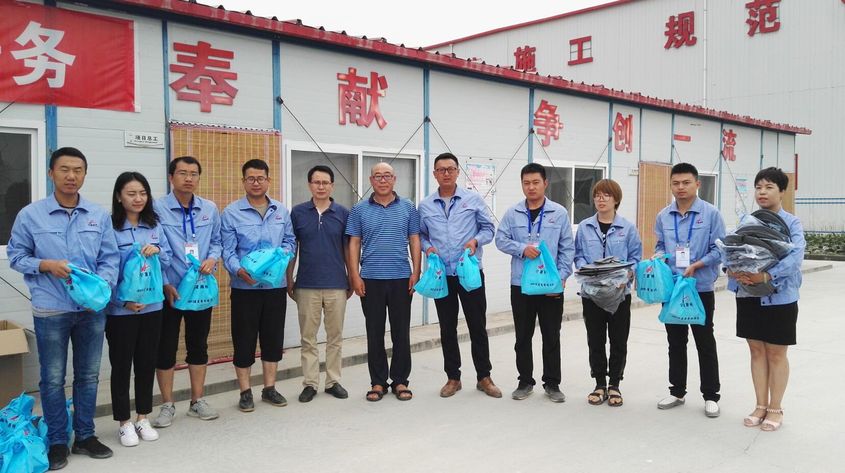7月5日至7月10日,工會(huì)主席蔡許川,黨群部主任、團(tuán)委書(shū)記蘇小杭等帶領(lǐng)工作人員來(lái)到施工一線(xiàn),北至干旱荒涼的平羅,東至鹽池,南至多雨的涇源,為公司24個(gè)項(xiàng)目開(kāi)展夏送清涼慰問(wèn)活動(dòng),將洗發(fā)水、沐浴露、香皂、毛巾、茶葉、冰糖、帽子等防暑降溫物品送到950名一線(xiàn)員工、勞務(wù)派遣、實(shí)習(xí)生、臨時(shí)工、租賃公司人員手中。