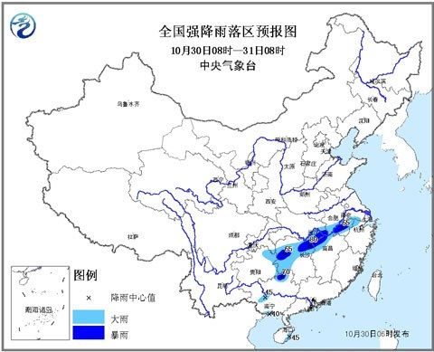 預(yù)計(jì),10月30日08時(shí)至31日08時(shí),重慶東南部、貴州東部、湖南西部和北部、湖北東南部、江西西北部、安徽南部、江蘇西南部、浙江西北部、廣西北部和南部沿海、海南東部等地的部分地區(qū)有大雨,其中湖南西部和東北部、湖北東南部、江西西北部、安徽南部、廣西北部等地局部有暴雨(50~80毫米)。